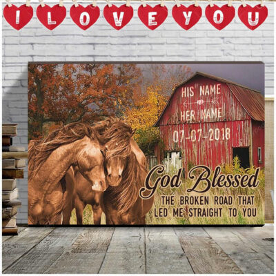 Horse Couple Farmhouse Wall Art, God blessed the broken road Canvas for Wife & Husband Birthday Gift