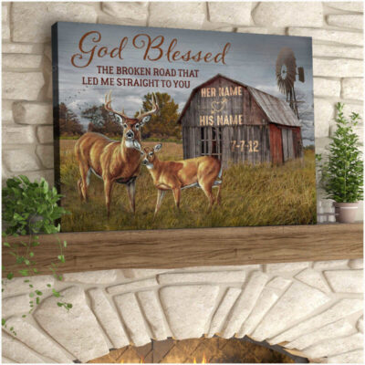 Personalized Deer Couple Wall Art, God blessed the broken road Wall Art Canvas for Husband and Wife