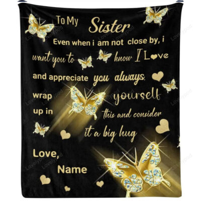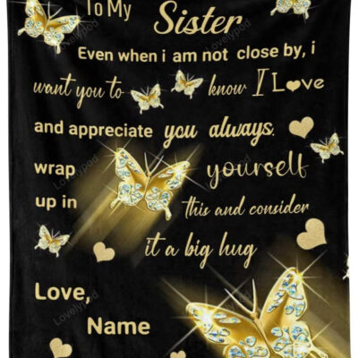 Custom Blanket Personalized To My Sister Gold Butterfly Heart Soft Fleece Throw Blanket With Name For Gifts Sofa Bed (50 X 60 Inches)