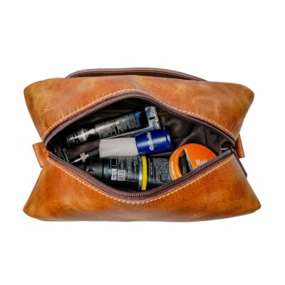 Keep your essentials and goods ready to go in style with this brown leather toiletry bag. It is handcrafted from genuine full-grain buffalo leather which is one of the highest quality leather available which makes it durable and feels soft at the same time.