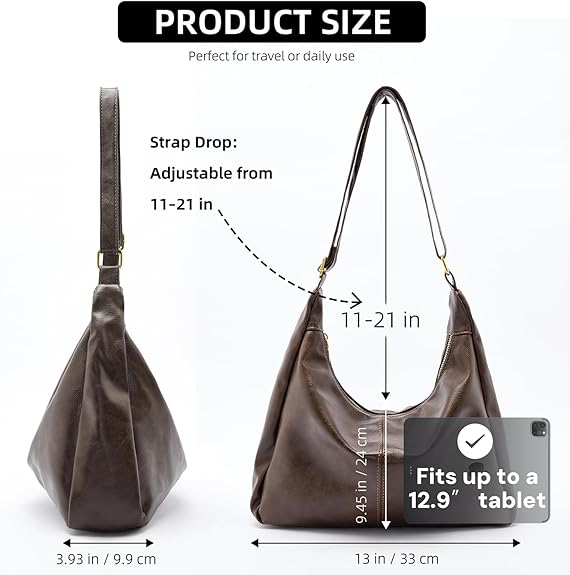 - This slouchy bags for women fits an iPad, phone, wallet, sunglasses, keys, and essentials. As a practical brown purse, it’s ideal as a multifunctional shoulder bag for work or a stylish business handbag